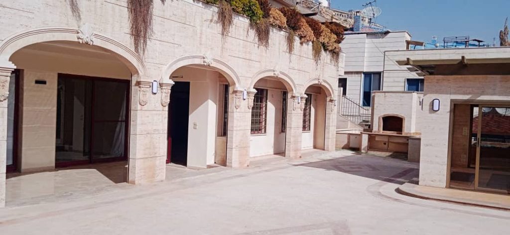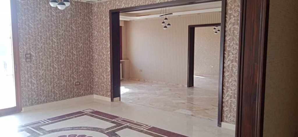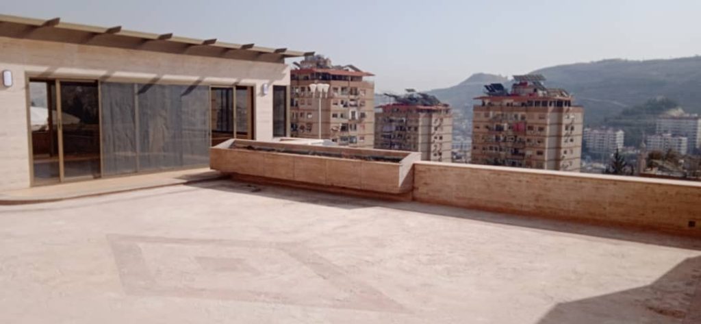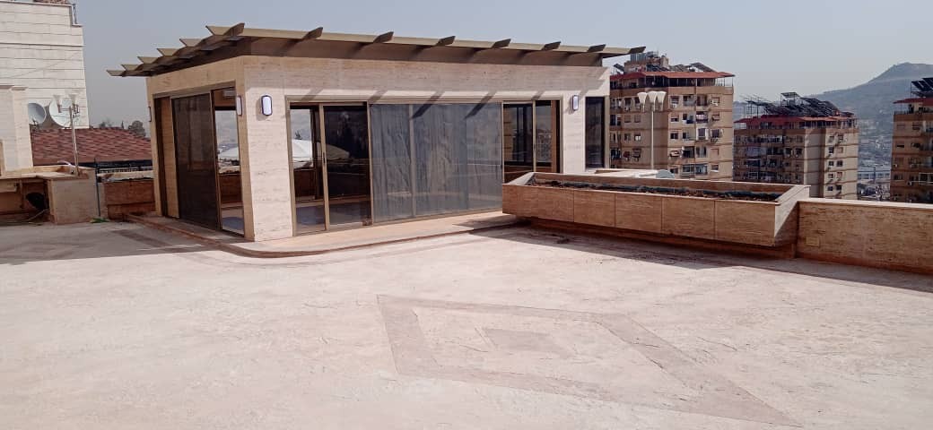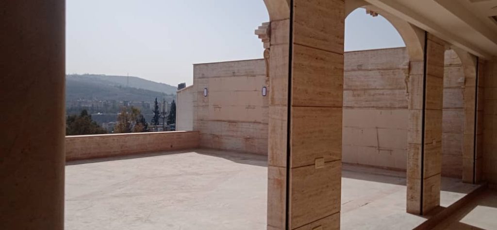 تراس فلات بموقع متميز واطلالة رائعة جدا الاكساء الخارجي حجر ترافلتينو رائع وديلكس الاكساء الداخلي الأرضيات رخام مع ووترجيت والأبواب خشب سنديان بحاجة لتجديد بعض الديكورات بالسقف .
