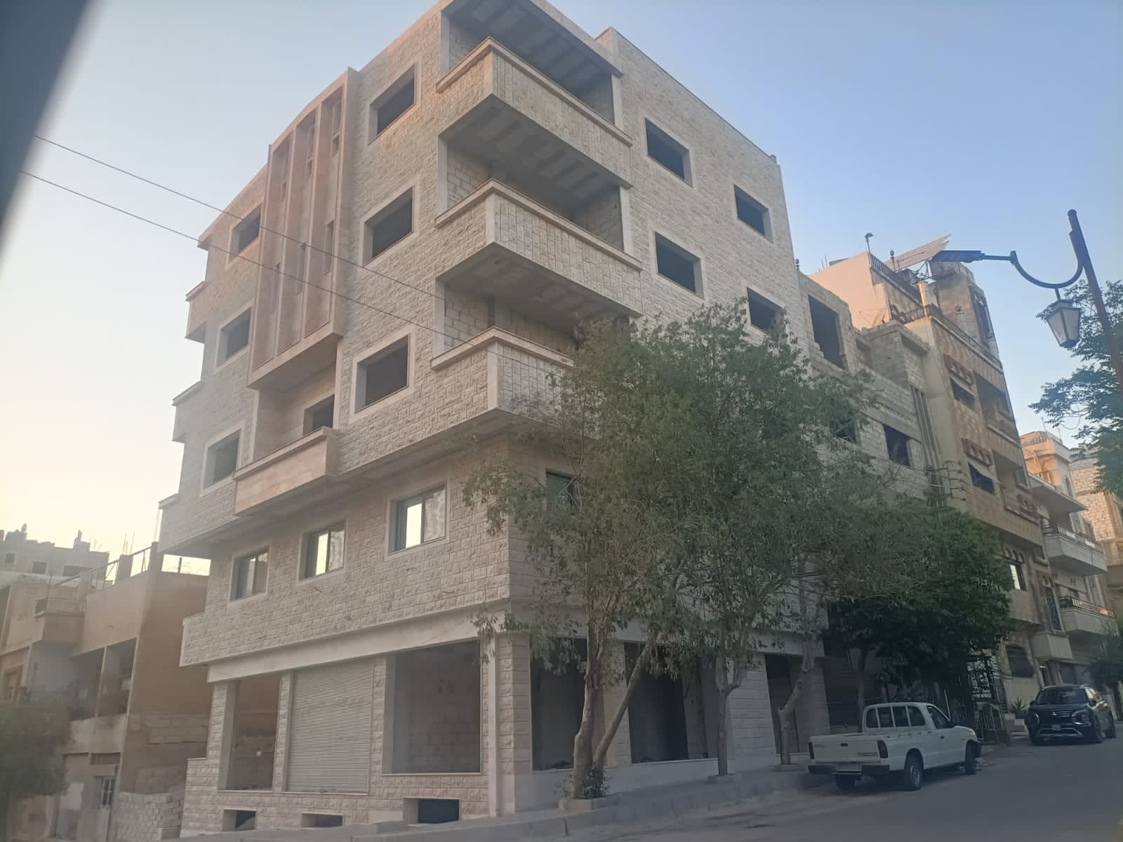 مبنى كامل عالعضم مكسي من الخارج قبو + 3 طوابق + نصاصي + محلات ارضي موقع على زاوية شارعين