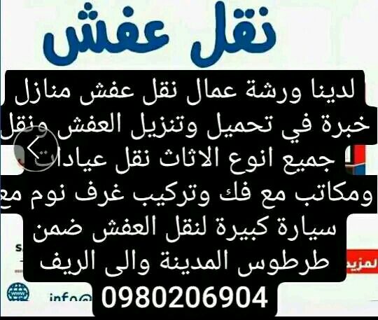 وين ماكنت بطرطوس لدينا ورشة عمال نقل عفش منازل خبرة في تحميل وتنزيل العفش ونقل جميع انواع الاثاث نقل عيادات ومكاتب مع نجار فك وتركيب غرف مع سيارة كبيرة وصغيرة ضمن طرطوس والمدينة والريف القريب .
